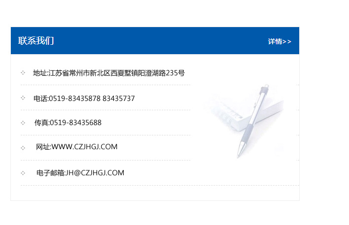 地址:常州市新北區友邦商務大廈1幢16、17層  電話:0519-85101652  傳真:0519-85112595  郵編:213022  網址:www.cz-jiayue_cn.xaluda.com  郵箱:xiajifengaa@163.com
